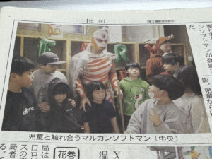 花巻のご当地ヒーロー【マルカンソフトマン】来所 “やるしかない”の思いを伝える。
